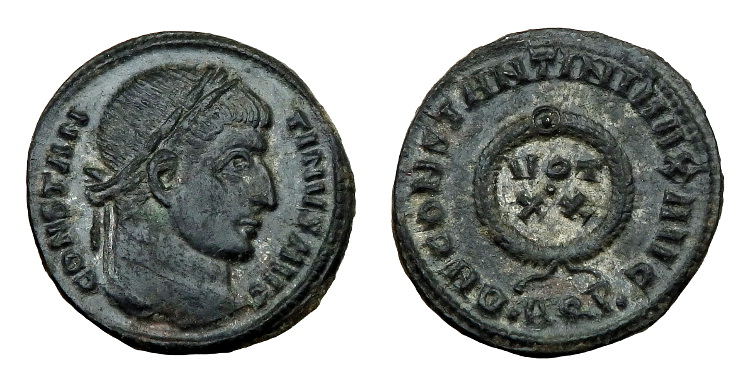 Reverse: D N CONSTANTINI MAX AVG, laurel wreath with jewel at apex enclosing VOT •XX in three lines, •AQP • in ex.