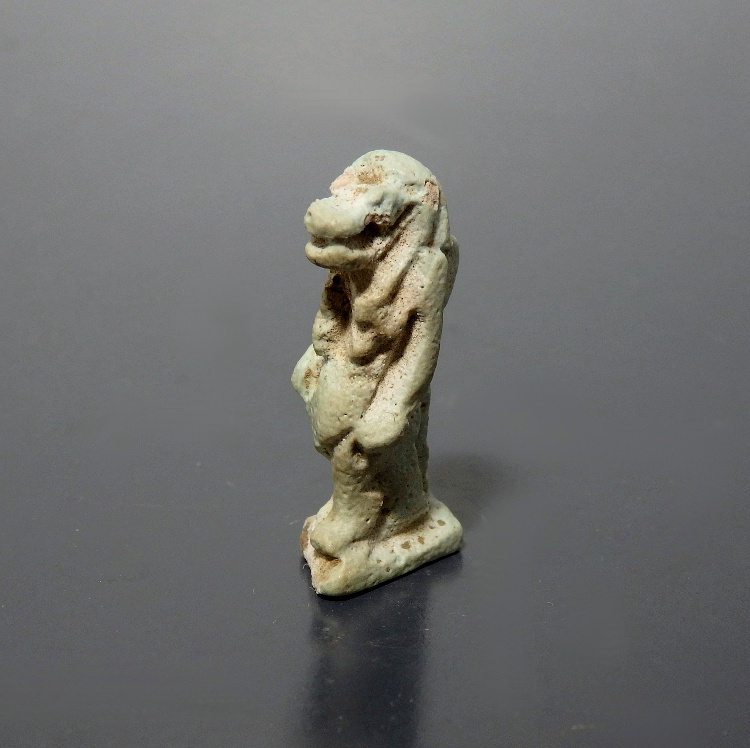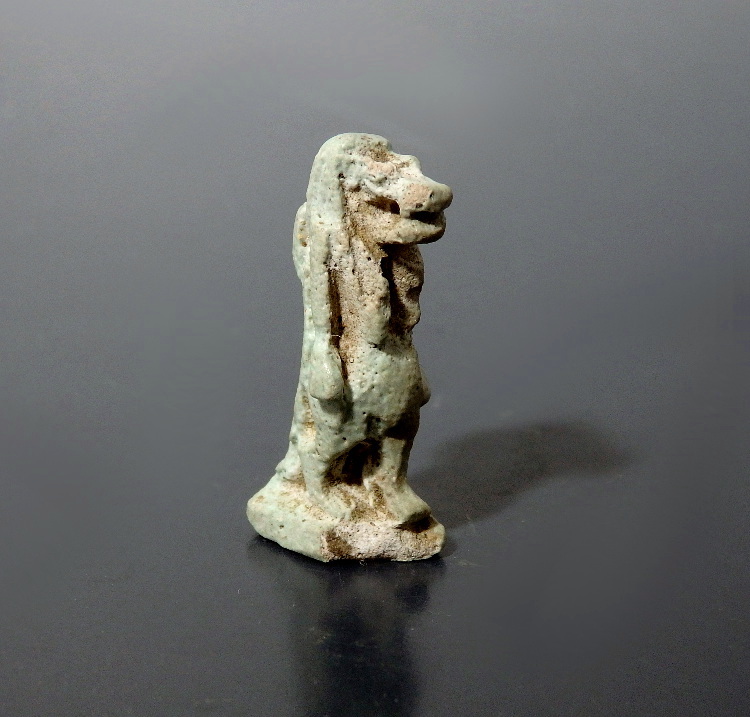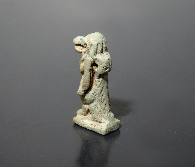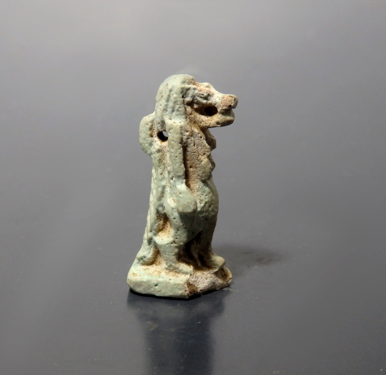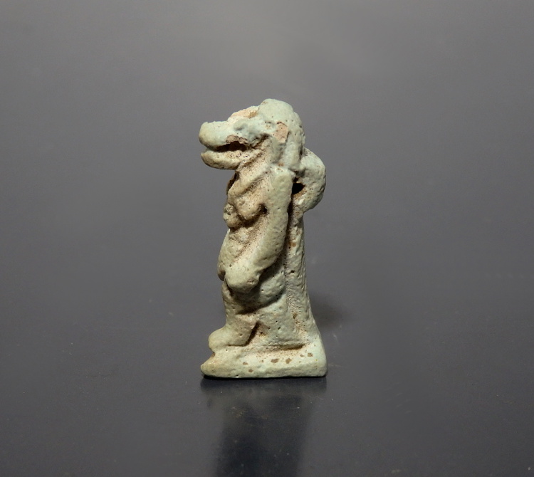 A nice pale blue faience Egyptian amulet of the goddess Taweret or Taurt, depicted as a heavily pregnant hippopotamus whose name means, “The great one”. She stands on an oblong base with her arms by her side and her left leg advanced. She has the body of a hippopotamus, limbs of a feline, most probably a lion and the usual long crocodile tail hanging down her back. It has nice incised detail and suspension loop to the back.