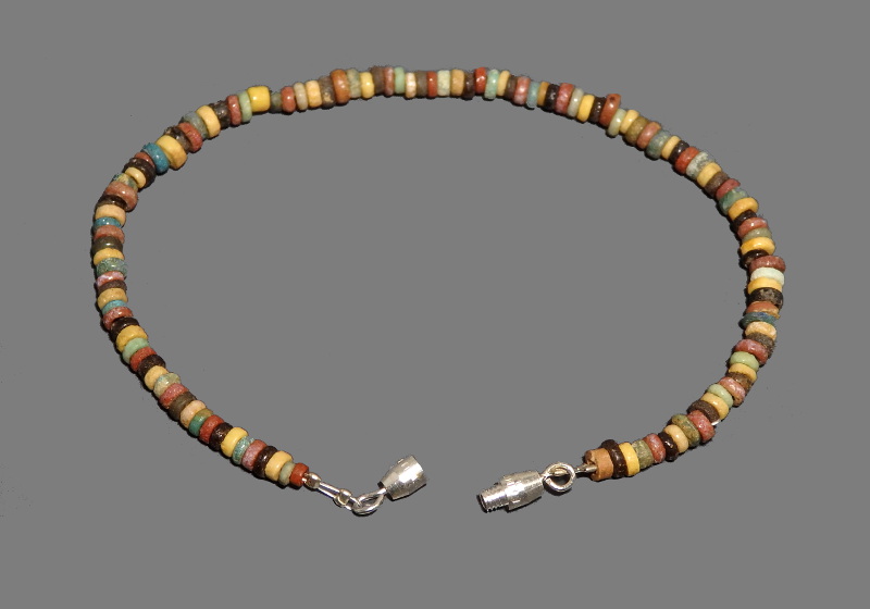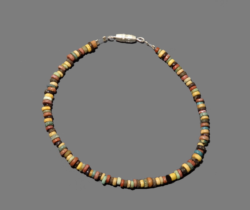 A beautiful ancient Egyptian bracelet, consisting of small flattened disc-shaped faience beads, in black, red, yellow, green and blue typical of the New Kingdom Period.