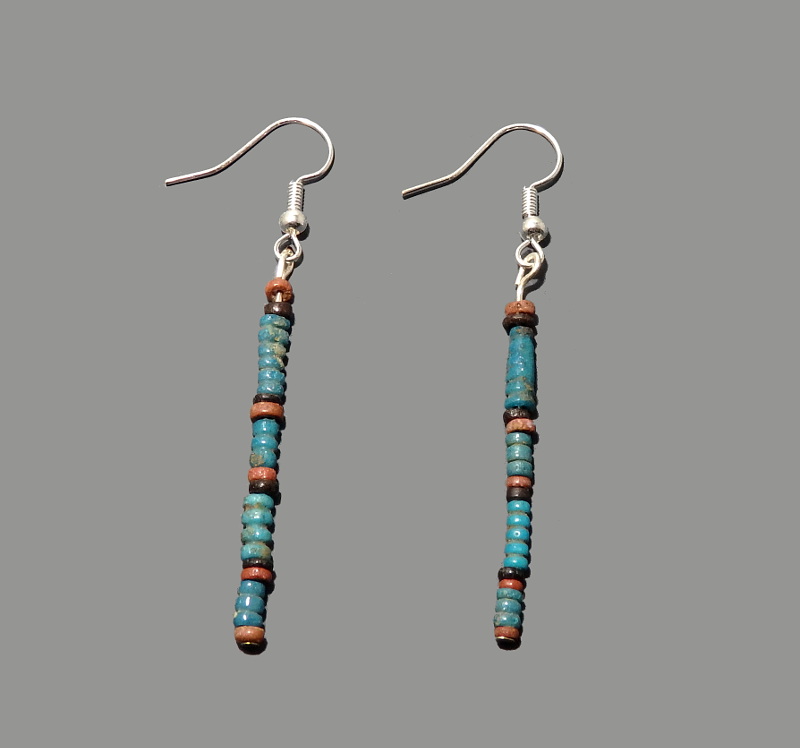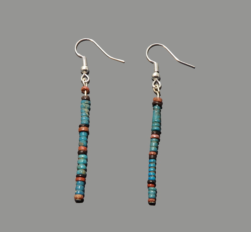 A beautiful pair of Egyptian faience earrings made from a nice selection of dark turquoise tubular beads, interspersed with small flattened small disc-shaped beads in black and red.