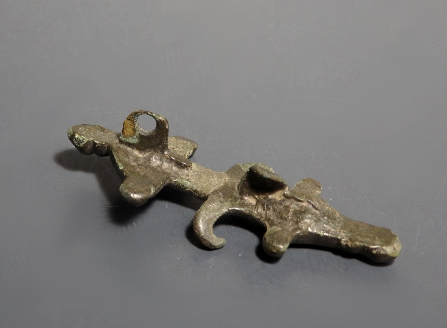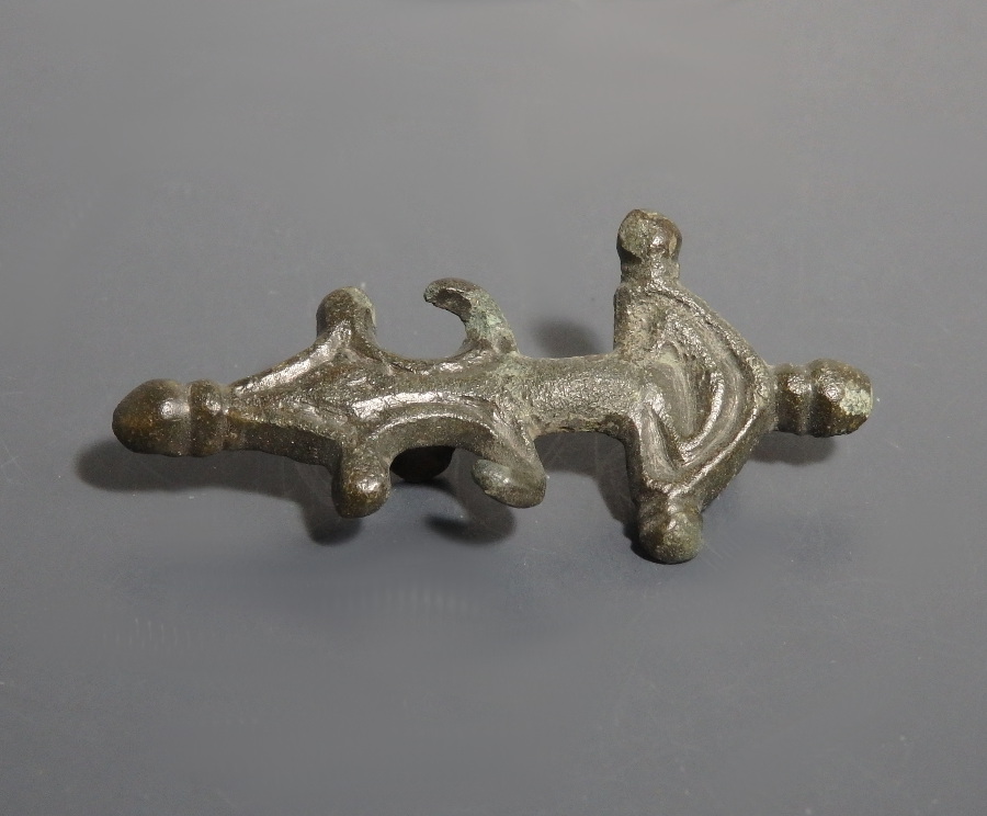 Slightly misshapen with minor nick to projecting terminal otherwise a nice piece with a dark patina. Pin missing.