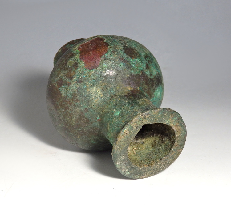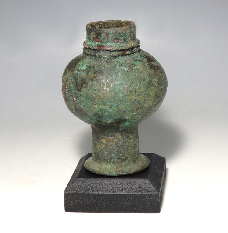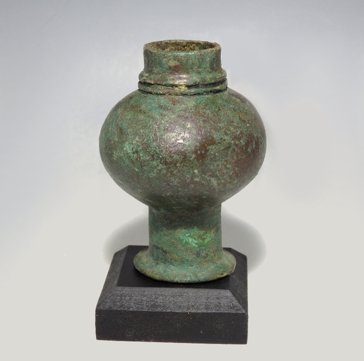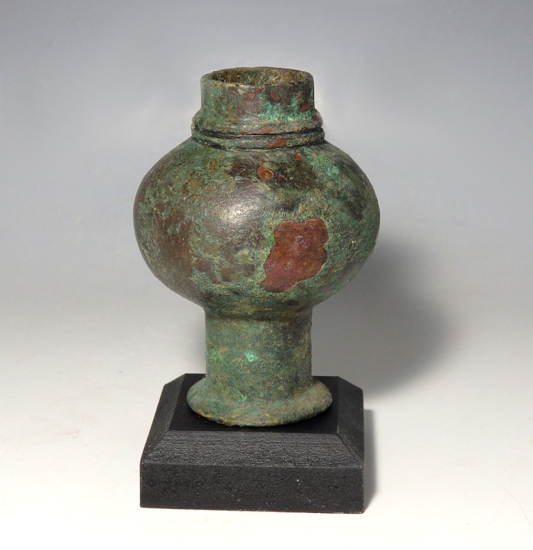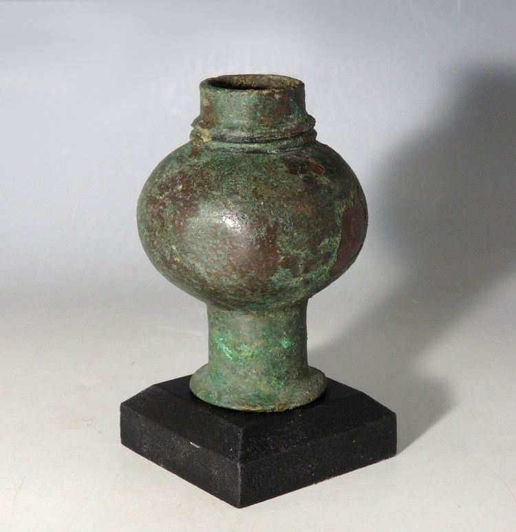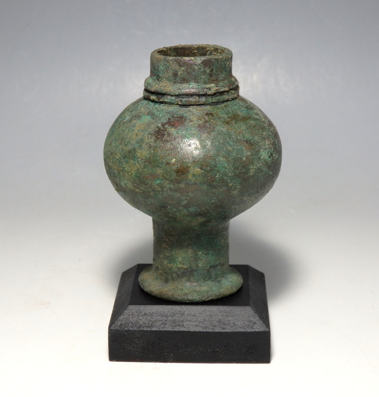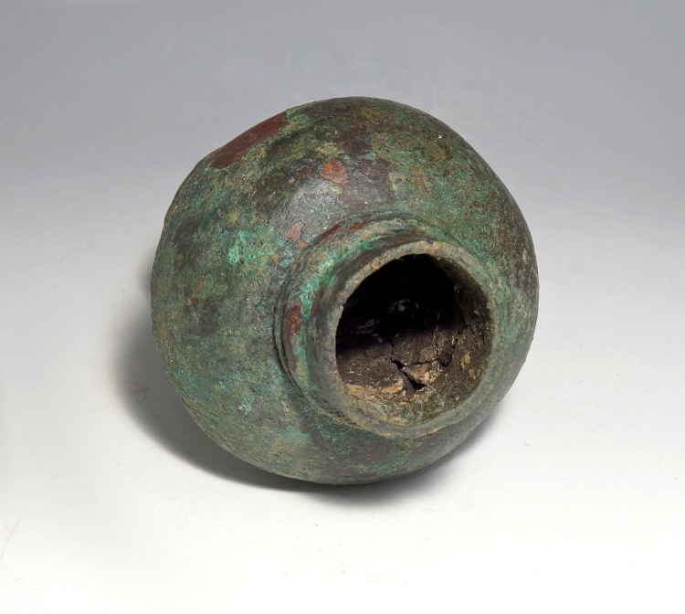 A bronze, hollow-cast mace head featuring a globular head with grooved bands above and a cylindrical shaft.