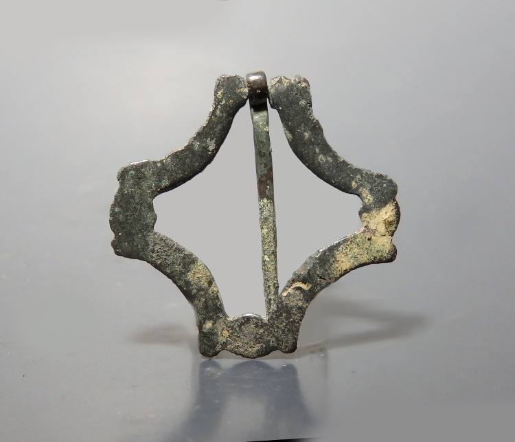 A flat, bronze medieval lozenge-shaped brooch with free-moving central pin.