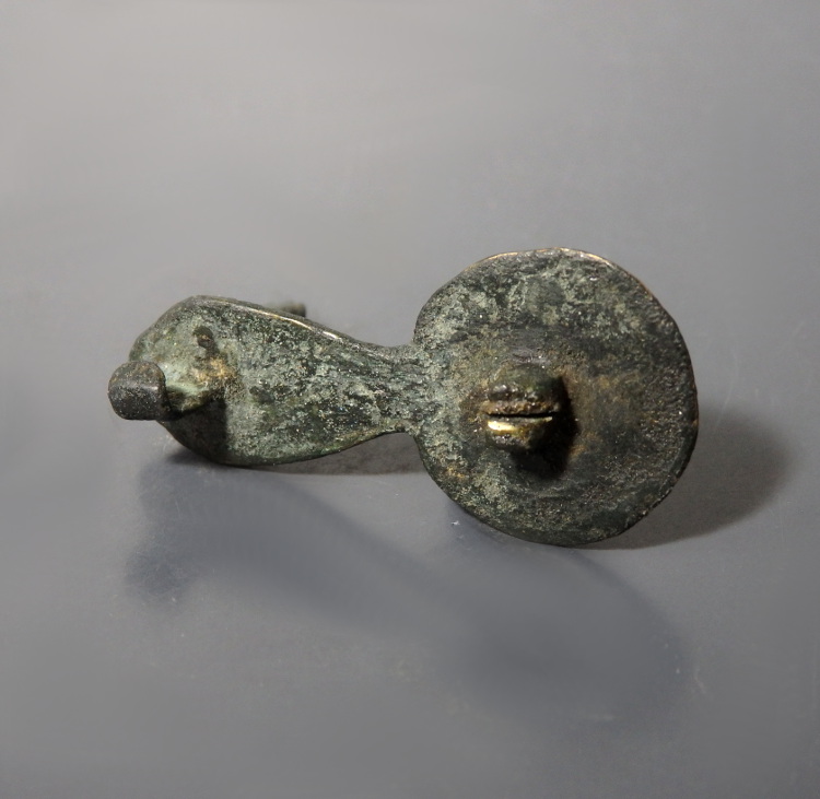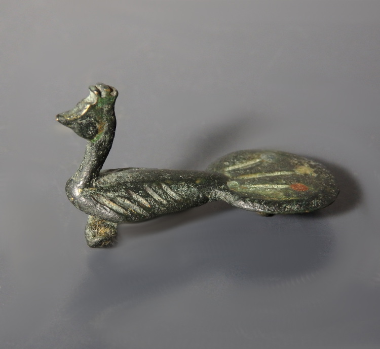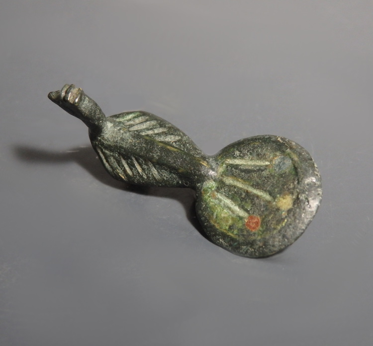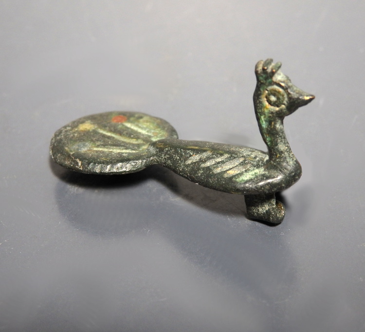 A cast bronze Roman zoomorphic brooch in the form of a peacock, with a tapered body and spread tail, with incised panels with traces of enamel in red and yellow to the tail. These would have been used to fasten garments.