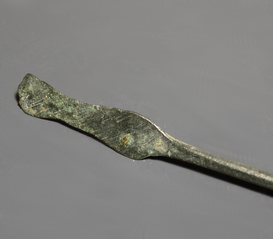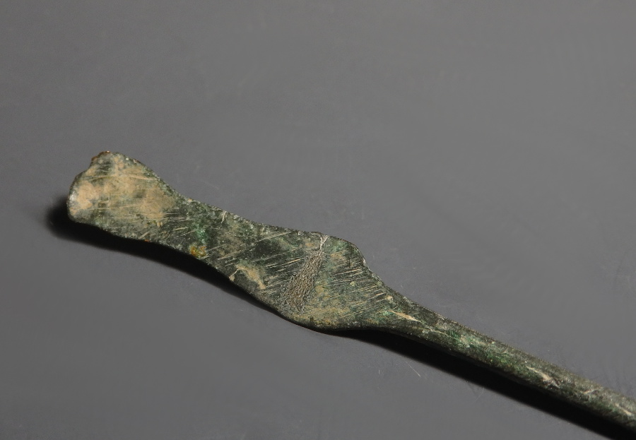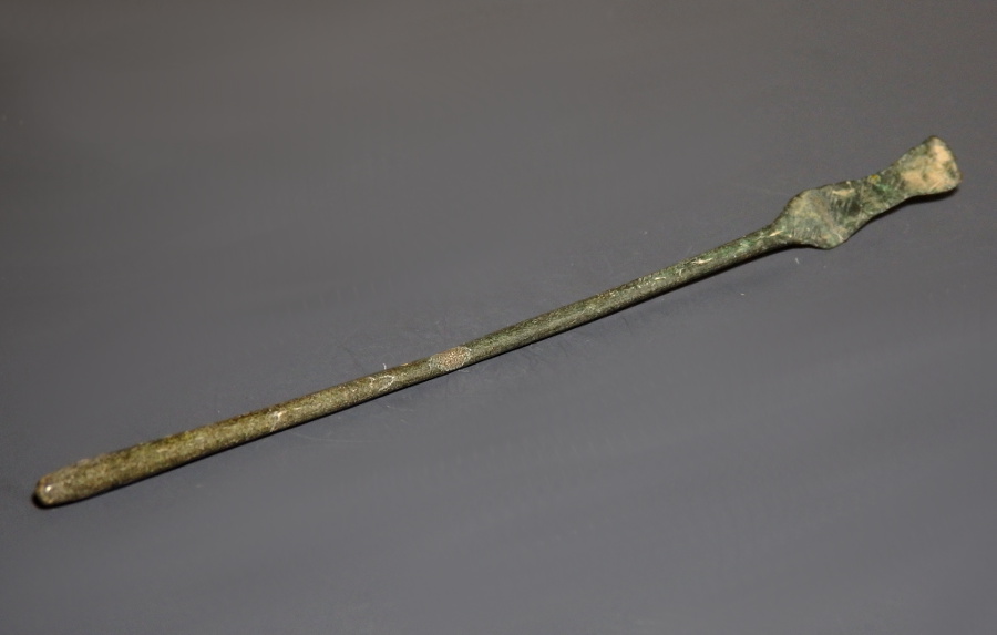 A Roman bronze needle ligula used for extracting ointments or powders from narrow glass phials containers and perhaps also apply them.