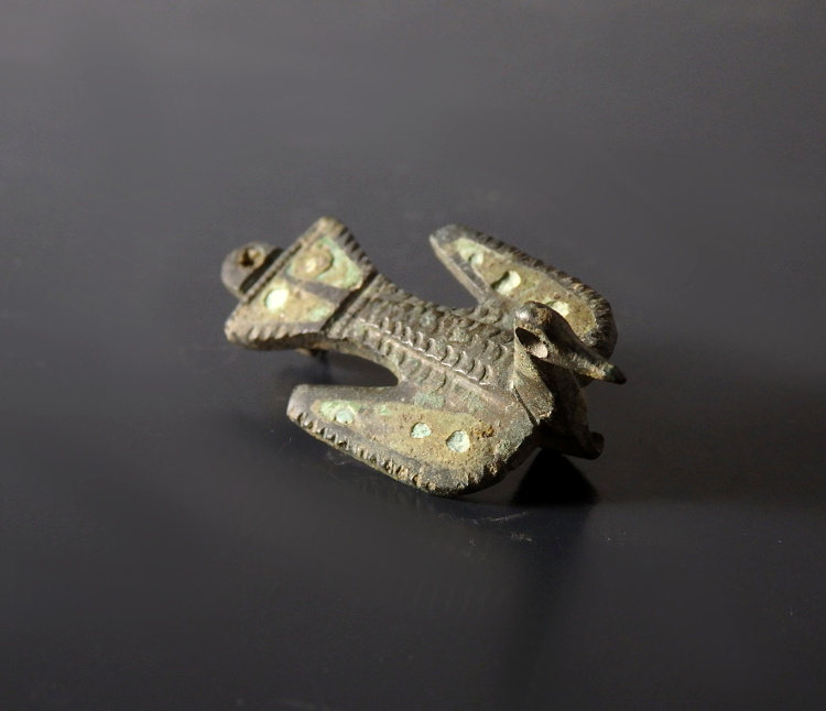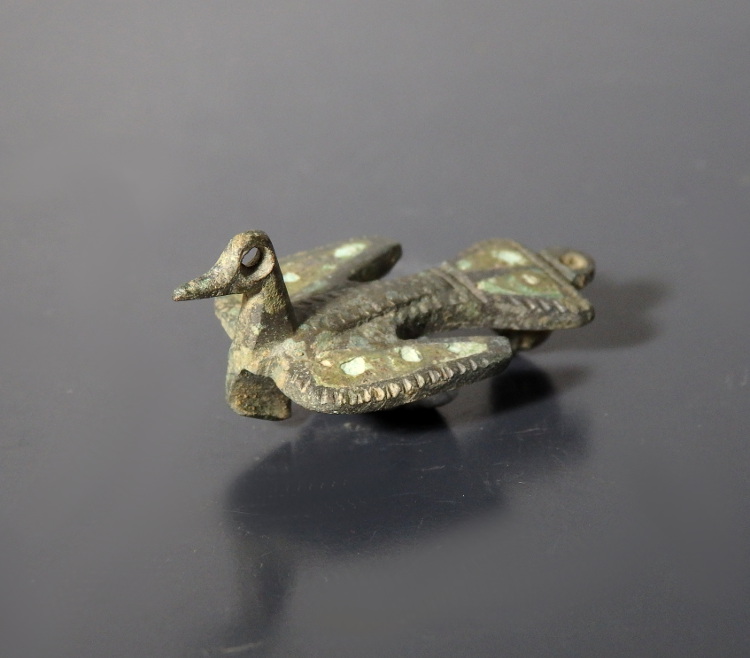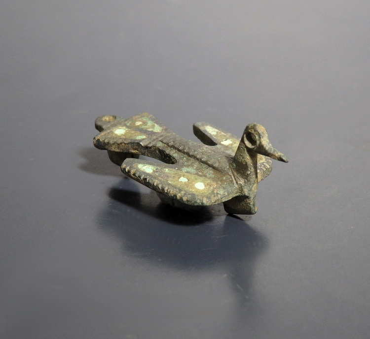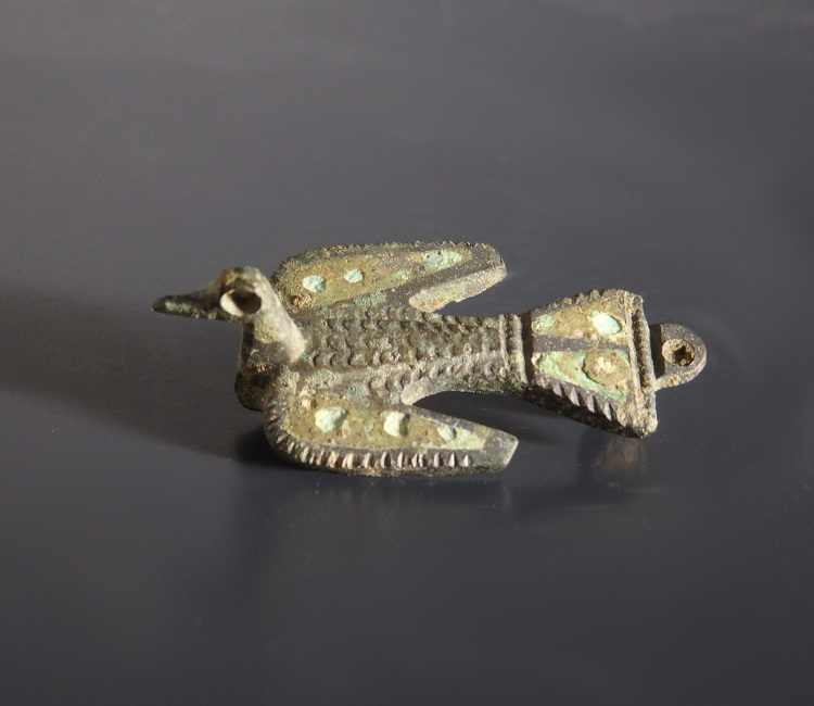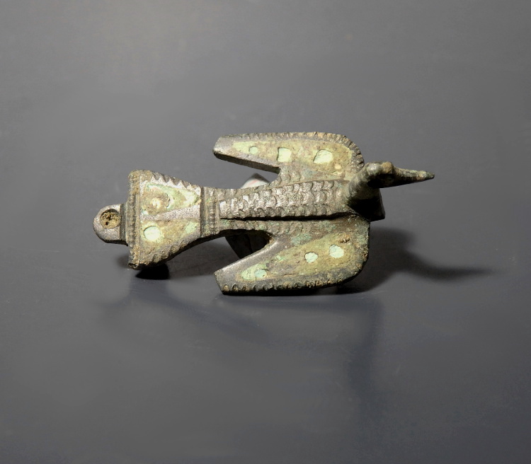 A bronze zoomorphic brooch in the form of a bird in flight, with a flat body and spread wings. The wings and tail feathers each contain triangular cells of dark green enamel. The bird’s back is decorated with crescent shaped punch marks indicating the feathers.