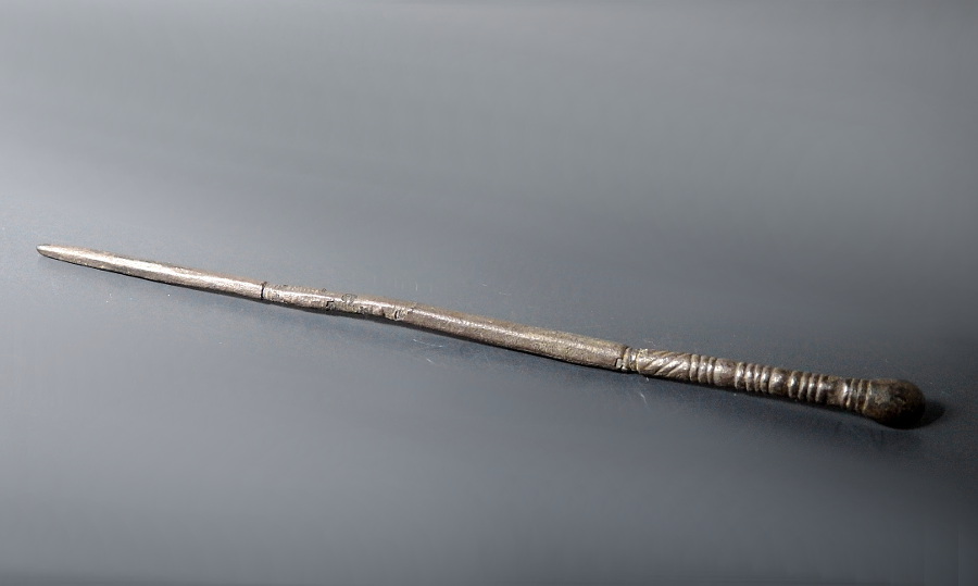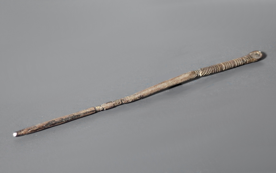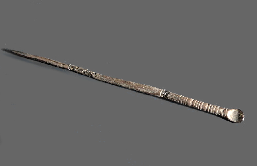 A small Roman silver ligula/ear scoop with a small circular bowl, decorated with incised grooves below. This item is used for removing wax, and for applying medicines to the eyes and ears.