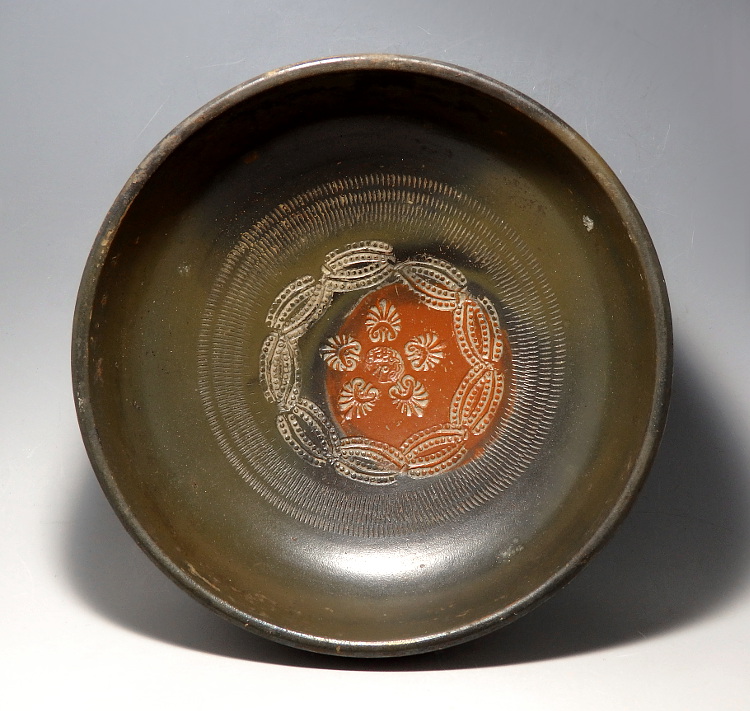 A finely decorated Apulian, black-glazed terracotta bowl, with stamped palmettes and linear patterns to the centre over a red painted circle. It sits on a small raised circular foot.