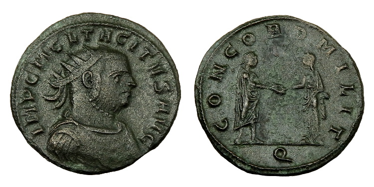 Reverse: CONCORD MILIT, Tacitus and Concordia standing vis-à-vis, clasping right hands, Q in ex.