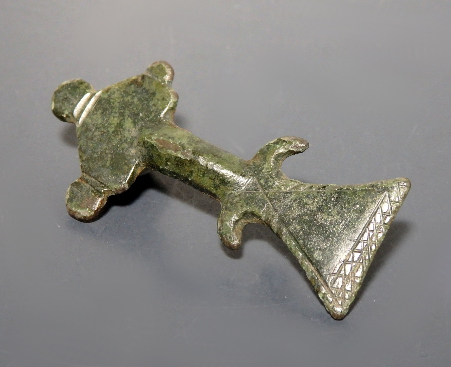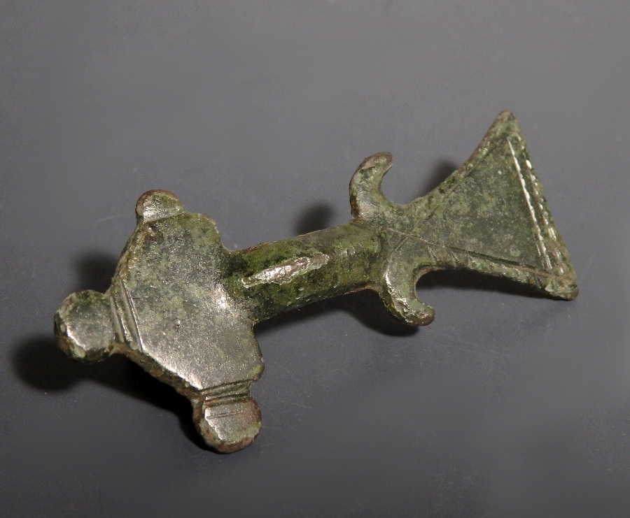 A nice example of a radiate-headed brooch, with a semi-circular head with three projecting terminals, leading down to a slightly arching bow with a central raised rib. The flat triangular footplate is decorated with incised linear patterns to the outer edge, and features curved projections at the top.